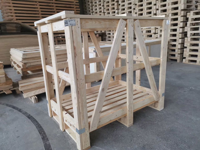 框架組合木箱是將木板條或木方先釘合成各種結構型式的框架,這種框架實際是箱子的骨架,在框架上再釘上木板、膠合板等,再組合成箱子??蚣芙M合箱是一種裝配式木箱,先將被包裝物與底座固定,再裝配成六面箱。一般用于包裝重型貨物,貨物重量可達10~15t。